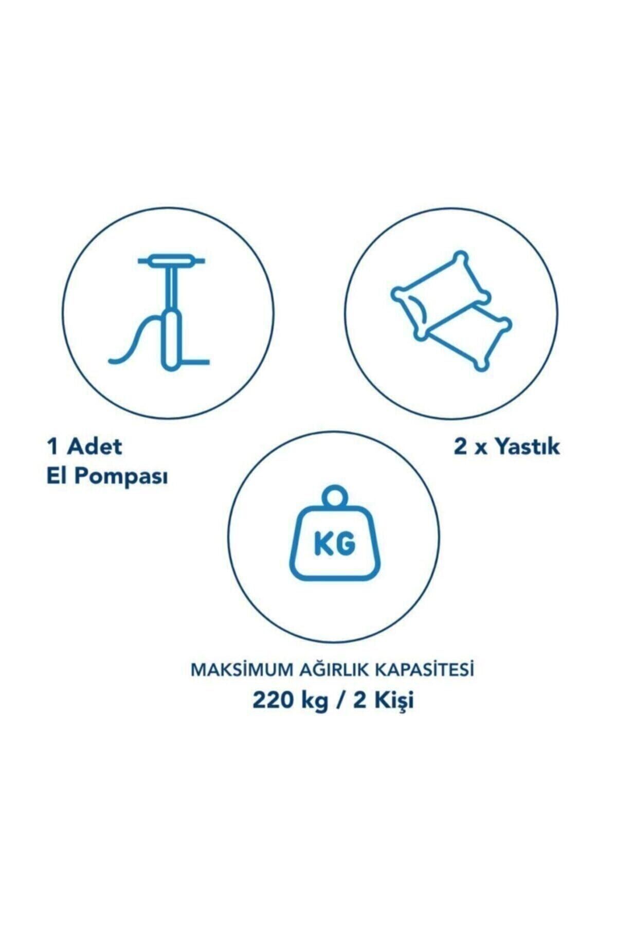 Yatak, entegre yastık bölmesiyle ekstra rahatlık sunarken, paket içeriğindeki 2 adet şişme yastık ve el pompası ile kullanım kolaylığı sağlar. Dayanıklı vinil gövde, özel bobin destekli iç yapısı ve kadifemsi üst yüzeyi ile konforlu bir uyku alanı oluşturur.