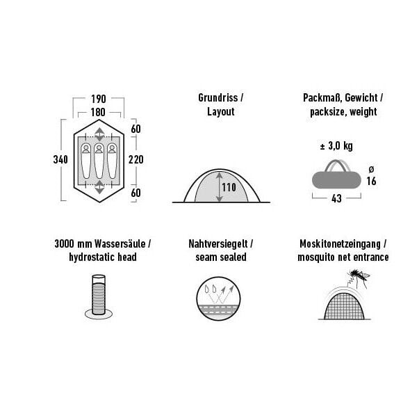 Yüksek kaliteli alüminyum direkli, kendi kendini destekleyen, hafif, 3 kişilik kubbeli çadır sadece 3,0 kg ağırlığındadır ve 43 x 16 cm'dir. 7001 T6 alüminyum direkler, yüksek kaliteli bir alüminyum alaşımı ve T6 sertlik derecesine sahiptir. İç bağlantı demir halkaları, pürüzsüz bir dış yüzey oluşturur ve kolay kullanım için direk tünellerine takılmadan kusursuz çalışır. Esnek ve güçlü alüminyum direkler, yüksek rüzgarda stabilite garanti eder. Süper hafif ve güçlü alüminyum kazıklar, çadırı ve gergi halatlarını güvenli bir şekilde yere sabitler. İç çadır, hızlı ve kolay kurulum için önceden monte edilmiştir ve yağışlı koşullarda kurulum sırasında iç çadırı kuru tutar. Çatı direği, hava koşullarına karşı korumalı iki giriş ve depolama alanını oluşturur. İki kalıcı, başlıklı havalandırma deliği, sürekli hava akışı sağlar. Tam işlev için havalandırmayı daima açık tutun.