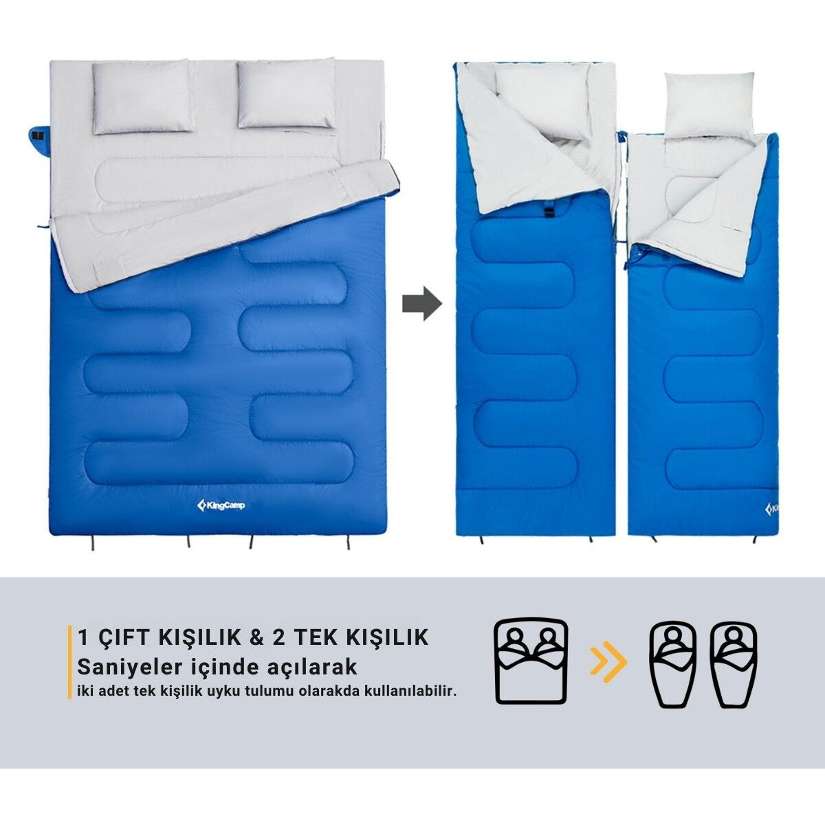 DuoSleep, sadece çift kişilik bir uyku tulumu değil; 2'si 1 arada bir tasarım harikasıdır. Kişiselleştirilmiş bir uyku deneyimi için iki ayrı tek kişilik uyku tulumuna ayırabilir veya geniş bir ortak uyku alanı için tekrar birleştirebilirsiniz.