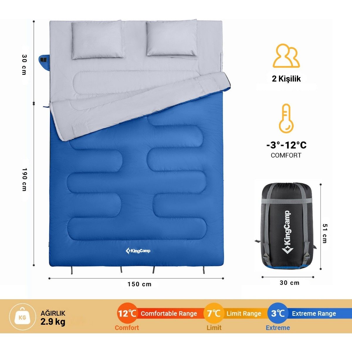 KingCamp Oxygen 250-D Çift Kişilik Yastıklı Uyku Tulumu